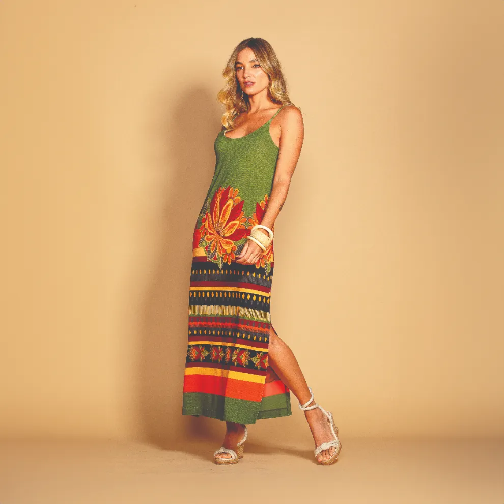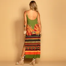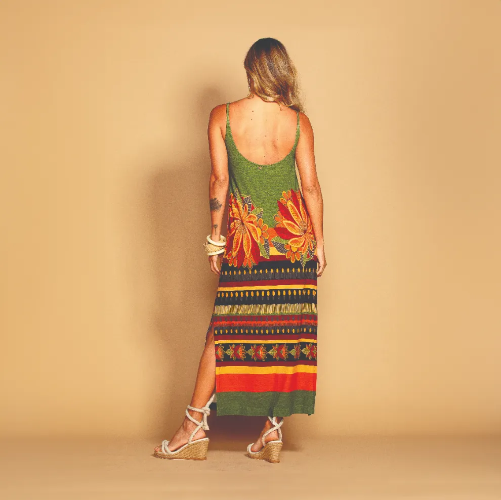 Featuring the unique local Brazilian Maná print, this dress brings an original vibe that sets you apart in any crowd. The thin straps add a delicate, feminine touch, while the removable cup feature provides customizable support, making it ideal for all-day wear.