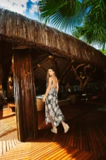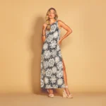 The adjustable waist ensures a flawless fit that highlights your curves in an elegant and comfortable way. The open back, contrasting with the high neckline, adds a touch of sensuality to the look, while the side slits and premium viscose fabric provide movement and a touch of femininity.
