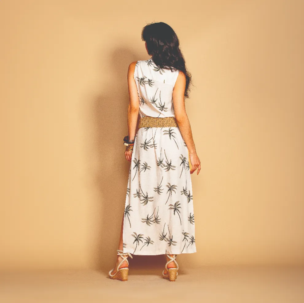 Made of light and airy fabric, the chemise offers a fluid fit that ensures comfort on hot days. The sleeveless design and long cut bring a relaxed and elegant look, ideal for those who value comfort and style. The Feriado print adds freshness and liveliness, making this piece a highlight on any occasion.
